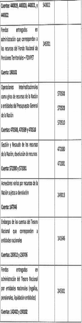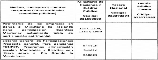Con el fin de guiar el reporte de las principales operaciones recíprocas de las diferentes entidades contables públicas con las tres unidades del Ministerio de Hacienda y Crédito Público se presenta la siguiente tabla o anexo que señala los hechos, conceptos, cuentas y subcuentas correlativas: