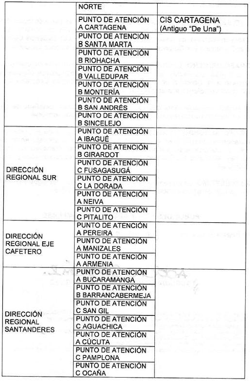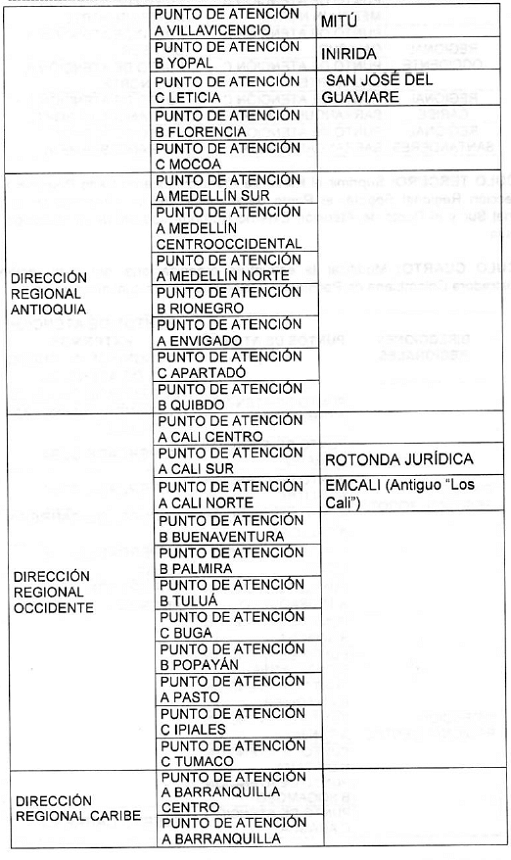 ARTÍCULO TERCERO. Suprimir el Punto de Atención Externo Sede Regional Bogotá de la Dirección Regional Bogotá, el Punto de Atención Virtual Chaparral de la Dirección Regional Sur y el Punto de Atención Externo Rotonda Judicial de la Dirección Regional Antioquia.