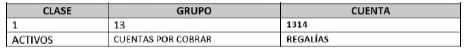 Por su parte, la entidad beneficiaria de la regalía debitará la subcuenta que corresponda de la cuenta 1904-PLAN DE ACTIVOS PARA BENEFICIOS POSEMPLEO y acreditará la subcuenta 133702-Sistema General de Regalías de la cuenta 1337-TRANSFERENCIAS POR COBRAR.
