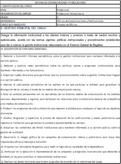 ARTÍCULO 1o. Modificar el Manual de Funciones establecido en la Resolución Organizacional número 170 del 5 de febrero de 2015, en el sentido de establecer las funciones para un cargo de Profesional Universitario, Grado 02 de la planta de regalías dentro de la Oficina de Comunicaciones y Publicaciones, así: