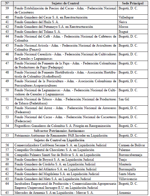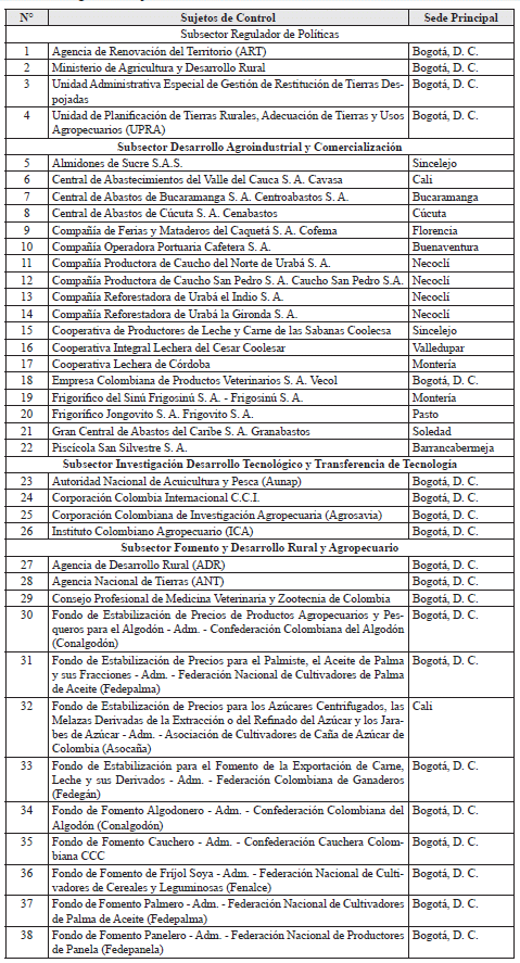 ARTÍCULO 2o. CONTRALORÍA DELEGADA PARA EL SECTOR AGROPECUARIO. <Resolución derogada por el artículo 21 de la Resolución 48 de 2019> La Contraloría Delegada para el Sector Agropecuario, será competente para ejercer vigilancia y control fiscal a los siguientes sujetos de control: