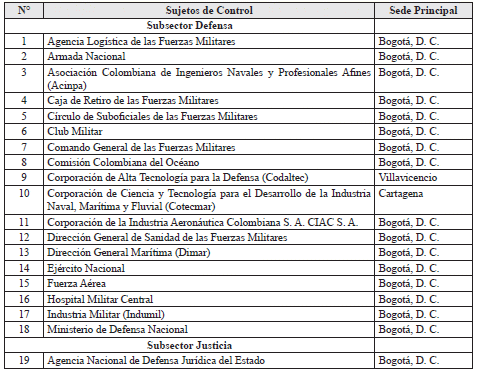 ARTÍCULO 4o. CONTRALORÍA PARA EL SECTOR DEFENSA, JUSTICIA Y SEGURIDAD. <Resolución derogada por el artículo 21 de la Resolución 48 de 2019> La Contraloría Delegada para el Sector Defensa, Justicia y Seguridad será competente para ejercer la vigilancia y el control fiscal a los siguientes sujetos de control: