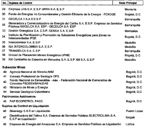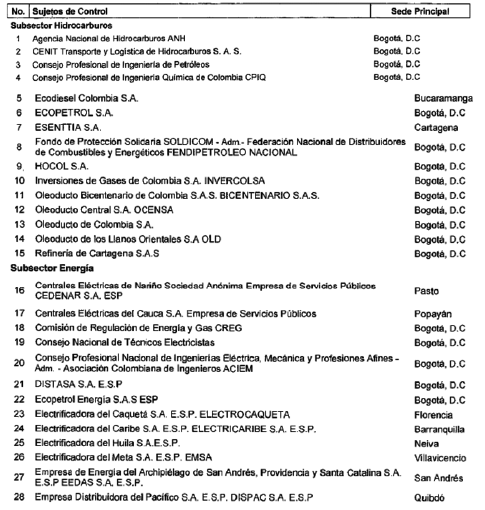 ARTÍCULO 12. CONTRALORÍA DELEGADA PARA EL SECTOR MINAS Y ENERGÍA. La Contraloría Delegada para el Sector Minas y Energía será competente para ejercer la vigilancia y el control fiscal a los siguientes sujetos de control:
