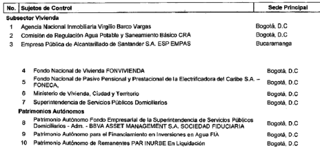 ARTÍCULO 15. CONTRALORÍA DELEGADA PARA EL SECTOR VIVIENDA Y SANEAMIENTO BÁSICO. La Contraloría Delegada para el Sector Vivienda y Saneamiento Básico será competente para ejercer la vigilancia y el control fiscal a los siguientes sujetos de control: