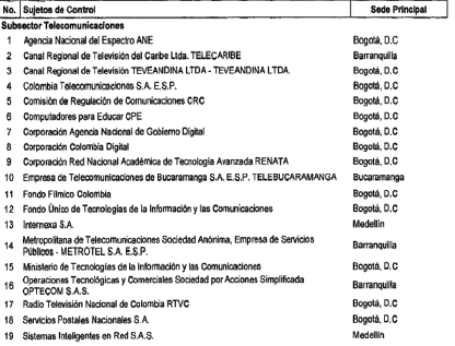ARTÍCULO 4o. CONTRALORÍA PARA EL SECTOR DE TECNOLOGÍAS DE LA INFORMACIÓN Y LAS COMUNICACIONES. La Contraloría Delegada para el Sector de Tecnologías de la Información y las Comunicaciones será competente para ejercer la vigilancia y el control fiscal a los siguientes sujetos de control: