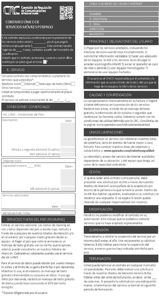 Asimismo, atendiendo a las distintas condiciones de prestación del servicio que puede elegir el usuario, es decir modalidad pospago o prepago, los proveedores de redes y servicios de telecomunicaciones móviles deben incorporar dichas condiciones en el modelo de contrato o en las condiciones generales, según aplique. Únicamente podrán realizarse modificaciones a los modelos de contrato y condiciones contenidos en el presente anexo, en lo que tiene que ver con la identificación del proveedor, cambiar el logo de la CRC por el del proveedor, el espacio de libre disposición, las condiciones comerciales, los vínculos a páginas web, la información que debe contener el QR (Quick Response Code), así como el color del encabezado de cada módulo, en todo caso el contrato estará sujeto a aprobación previa por parte de la CRC, a solicitud de parte. Para el caso de contratos suscritos para múltiples líneas en pospago, se deberá replicar el módulo de “Condiciones Comerciales” del contrato, las veces que sea necesario.