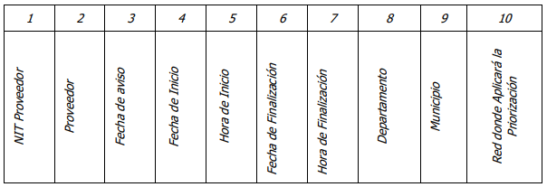 Los PSRT a los cuales les aplique el presente Formato, deberán reportar a la CRC al menos 24 horas antes de iniciar la priorización las evidencias suficientes que considere para justificar la priorización de tráfico, así como la siguiente información: (i) Fecha y hora del inicio de priorización de aplicaciones o contenidos; (ii) Fecha y hora de la finalización de priorización de aplicaciones o contenidos; (iii) Áreas geográficas donde se realizará la priorización, considerando que esta puede ser de carácter nacional (todo el país) o regional (un conjunto de municipios). En caso de que la priorización sea regional se debe informar: departamento y municipio; (iv) Tipo de red de acceso sobre la cual se aplicará la priorización (móvil y/o fija). Esto como se indica en el cuadro siguiente: