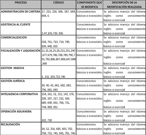 a) Adicionar en los siguientes perfiles de empleo pertenecientes a los procesos de Administración de Cartera, Asistencia al Cliente, Comercialización, Fiscalización y Liquidación, Gestión Masiva, Gestión Jurídica, Inteligencia Corporativa, Operación Aduanera y Recaudación un conocimiento básico o esencial: