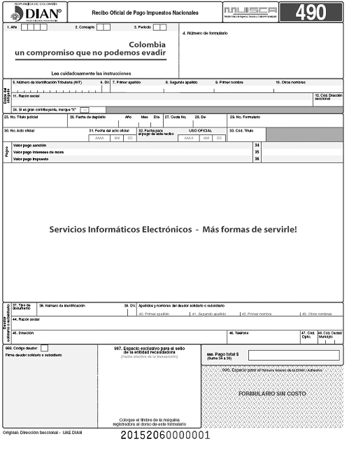 Los anexos (Formularios 140, 440 y 490) hacen parte integrante de la Resolución número 000034 de marzo 27 de 2015, por la cual se prescriben formularios para el cumplimiento de las obligaciones tributarias, correspondientes al año 2015, la cual fue publicada en el Diario Oficial número 49469 del 30 de marzo de 2015.
