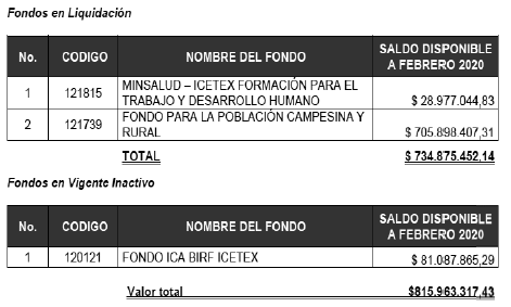 Que conforme la certificación de fecha 9 de julio de 2020, el Vicepresidente de Fondos en Administración da cuenta que el Fondo MinSalud-Icetex Formación para el Trabajo y Desarrollo Humano y el Fondo para la Población Campesina y Rural en liquidación, y el Fondo ICA-BIRF-Icetex vigente Inactivo, cuentan con saldo total disponible por valor de ochocientos quince millones novecientos sesenta y tres mil trecientos diecisiete con 43/100 ($815.963.317,43) moneda corriente, y con los documentos de utilización de recursos disponibles debidamente diligenciados conforme a lo previsto en los Decretos Legislativos 467 y 662 de 2020, y con el siguiente detalle: