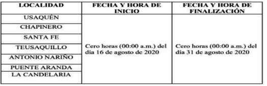 “…SUSPENDER las condiciones establecidas en el numeral 2 y el parágrafo 1 del artículo 1o de la Resolución número 000-0871 de 2020, a partir del 13 de julio de 2020; las cuales serán reanudadas el 1 de septiembre de 2020, de conformidad con los lineamientos establecidos en la Alcaldía Mayor de Bogotá a través de los Decretos 169 y 186 de 2020…”
