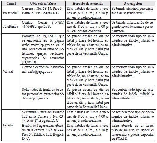 ARTÍCULO 23. CANALES Y HORARIOS DE ATENCIÓN. Los canales y horarios de atención establecidos por la JEP así como para la presentación de peticiones, quejas, reclamos, sugerencias, denuncias y felicitaciones son: