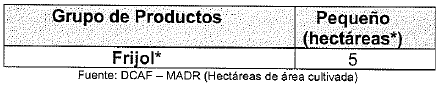 - En estas condiciones, en lo que corresponde al grupo de productos agrícolas “fríjol'', la Dirección de Cadenas Agrícolas y Forestales revisó el valor establecido para la clasificación del tamaño de productor, fijando como parámetro para pequeño productor un área de hasta cinco (5) hectáreas.
