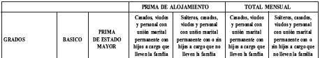 ARTÍCULO 1o. Para los efectos previstos en el artículo 15 del Decreto 923 de 2005; en los artículos 74 y 86 del Decreto-ley 1211 de 1990; artículos 83 y 84 del Decreto-ley 1790 de 2000; artículos 67 y 79 del Decreto-ley 1212 de 1990; artículos 29 y 37 del Decreto-ley 1213 de 1990; artículos 3o y 9o del Decreto 1091 de 1995; artículos 41 y 42 del Decreto-ley 1791 de 2000, fijar como haberes para el personal de las Fuerzas Militares y la Policía Nacional que sea destinado en comisión permanente al exterior, en dólares estadounidenses y a razón de un dólar por cada peso, los valores mensuales del sueldo básico, de la prima de estado mayor y de la prima de alojamiento que para cada caso se indica a continuación: