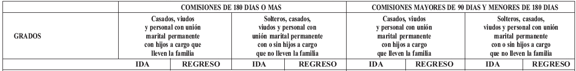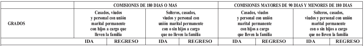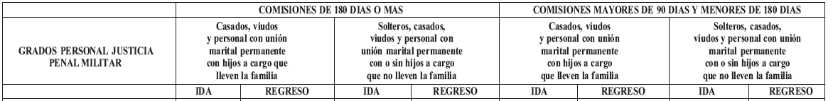 e) Para el personal dealféreces, guardiamarinas, pilotines y cadetes destinado acomisiones transitorias e invitaciones al exterior, los Comando de Fuerza o laDirección General de la Policía Nacional, según el caso, podrán proponer elreconocimiento y pago de viáticos diarios en dólares estadounidenses, a razón deun dólar por cada peso, hasta el uno punto nueve por ciento (1.9%) del valor deun día de sueldo básico de un subteniente o teniente de corbeta.