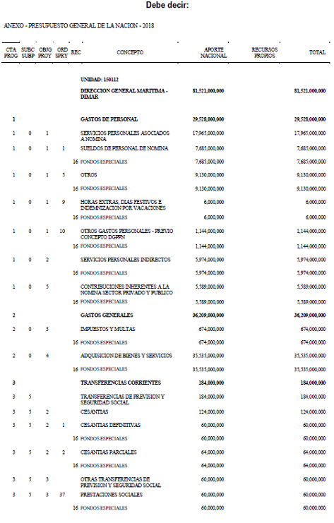 Que en el Anexo del Decreto número 2236 de 2017, se incurrió en un error de transcripción, en el presupuesto de gastos de funcionamiento de la Dirección General Marítima (Dimar);