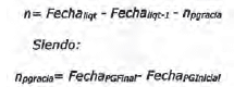 n: Duración del primer período de liquidación de la cobertura, para lo cual: i) se calculará el número de días calendario entre el día siguiente a la fecha de la anterior liquidación de la cobertura que debió realizarse en la fecha de corte más próxima al inicio del período de gracia (Fechaliqt-1) y la fecha en que deba realizarse la primera liquidación de la cobertura después de haberse terminado dicho período (Fechaliqt); y ii) se restará del resultado anterior el número de días calendario del período de gracia (npgracia) existentes entre la fecha de inicio (FechaPGInicial) y la fecha final (FechaPGFinal) del período de gracia del crédito o del contrato de leasing habitacional.