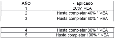 PARÁGRAFO 2o. Durante los primeros cinco años contados a partir de la entrada en vigencia de la reglamentación de los aportes al FCEE por concepto de sentencias y conciliaciones judiciales, el monto de los aportes deberá corresponder al valor necesario para completar los porcentajes establecidos en la siguiente tabla: