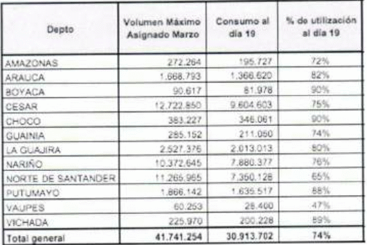 Una vez analizada la información, se visualiza que en lo corrido del mes. el consumo de los departamentos presenta un incremento que permite concluir que el volumen disponible es insuficiente para finalizar con combustible y requiere un volumen máximo adicional asignado para satisfacer la demanda de combustibles.