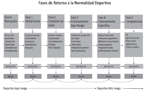 En el caso de los deportistas de alto rendimiento se ha adoptado un modelo de fases basado en la consecución del estado de forma óptimo por parte del atleta para afrontar la fase final de competencia y limitar la aparición de lesiones producto del desacondicionamiento físico. Esto implica que el reinicio de la práctica debe hacerse de forma gradual y con intensidades bajas que podrán ir en aumento de manera progresiva. La siguiente figura describe las fases hacia el retorno de la normalidad deportiva.