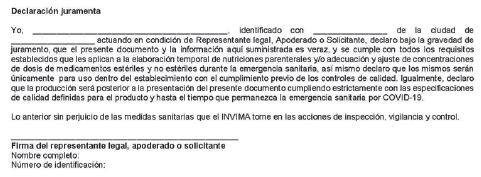 ARTÍCULO 6o. AUTORIZACIÓN DE ELABORACIÓN DE NUTRICIONES PARENTERALES Y/O ADECUACIÓN Y AJUSTE DE CONCENTRACIONES DE DOSIS DE MEDICAMENTOS ESTÉRILES Y NO ESTÉRILES. Los servicios farmacéuticos y establecimientos farmacéuticos con central de mezclas interesados en elaborar nutriciones parenterales y/o realizar adecuación y ajuste de dosis de medicamentos estériles y no estériles, durante la emergencia sanitaria, previa declaración de desabastecimiento o sobredemanda por parte del INVIMA, podrán presentar ante el INVIMA una solicitud en el formato que defina la entidad con la siguiente información: