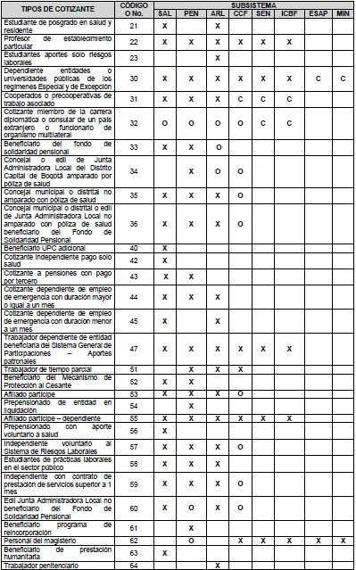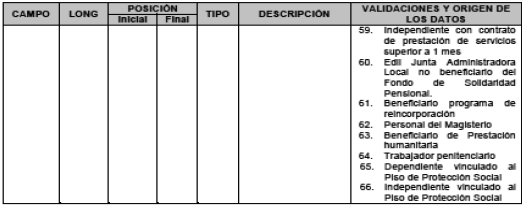 65- Dependiente vinculado piso de protección social: Este tipo de cotizante es utilizado por empleadores para el pago del aporte al Piso de Protección Social de las personas vinculadas laboralmente por tiempo parcial y que en virtud de ello reciban un ingreso total mensual inferior a un (1) Salario Mínimo Legal Mensual Vigente.