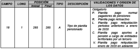 5.2 La adición del tipo de planilla “V - Planilla pago reliquidación enero de 2020 en adelante” establecida en el campo “18 - Tipo de planilla pensionado del numeral 2.1.1. “Estructura registro tipo 1 del archivo tipo 2. Encabezado” del Capítulo 1 “Archivos de entrada” y en el numeral 2.1.2.2 “Campo 18 - Tipo de planilla pensionado” del Capítulo 1 “Archivos de entrada”, deberá ser implementada por todos los actores del Sistema de Seguridad Social Integral y parafiscales para los pagos que realicen los pagadores de pensiones a partir del 1o de abril de 2021, para los periodos de cotización de enero de 2020 en adelante.