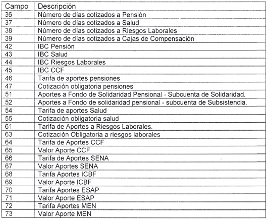 | 7 | 1 | 227 | 227 | A | Tipo de planilla | Este campo es obligatorio y lo suministra el aportante. E: Planilla Empleados Y: Planilla Independientes Empresas A: Planilla cotizantes con novedad de ingreso I: Planilla Independientes S: Planilla Empleados de servicio doméstico M: Planilla Mora N: Planilla Correcciones T: Planilla Empleados entidad beneficiaria del Sistema General de Participaciones F: Planilla pago aporte patronal faltante, de una entidad beneficiaria del Sistema General de Participaciones. J: Planilla para pago seguridad social en cumplimiento de sentencia judicial. X: Planilla para el pago empresa liquidada U: Planilla de uso exclusivo de la UGPP para pago por terceros. |