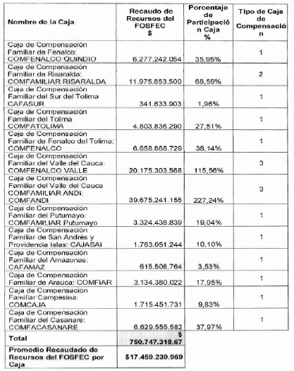 Para efectos de la presente Resolución, las Cajas de Compensación Familiar se clasificarán en tres (3) tipos, de acuerdo con la relación entre los recursos recaudados para el Fosfec en cada Caja y el promedio de recursos recaudados para la totalidad de las Cajas de Compensación Familiar de dicho fondo para la vigencia inmediatamente anterior, con la siguiente fórmula: