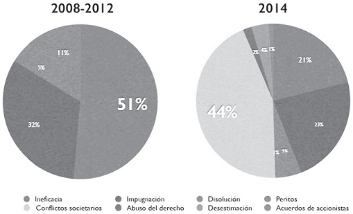 Séptimo. Que se ha detectado una creciente complejidad técnica en los procesos societarios sometidos a consideración de la Superintendencia. Como aparece en la Tabla No. 2, el 51% de los procesos societarios tramitados entre 2008 y 2012 tuvieron como fundamento el reconocimiento de presupuestos de ineficacia. A su vez, entre las acciones de ineficacia presentadas por los usuarios, el 58% estuvo basado en simples falencias en la convocatoria a reuniones del máximo órgano social. Es decir que, durante el lapso en cuestión, la actividad judicial de la Superintendencia estuvo concentrada, principalmente, en uno de los asuntos de menor complejidad en el ordenamiento societario colombiano. Entre 2012 y 2014, sin embargo, los usuarios de la Superintendencia empezaron a debatir asuntos de mayor complejidad ante la Delegatura. Tal y como consta en la Tabla No. 2, la mayoría de las demandas tramitadas durante el año 2014 estuvo relacionada con la resolución de conflictos societarios, al amparo de lo previsto en el artículo 24 del Código General del Proceso. Con fundamento en esa facultad, se debatieron asuntos tales como la exclusión de accionistas por virtud de los denominados arbitrios de indemnización, la interpretación de cláusulas estatutarias y la aplicación del derecho de preferencia en hipótesis de adjudicación de cuotas sociales. Adicionalmente, los usuarios de la Delegatura han empezado a presentar numerosas demandas con base en los sofisticados mecanismos de fiscalización judicial introducidos por la Ley 1258 de 2008, incluidas las acciones de abuso del derecho de voto, ejecución específica de acuerdos de accionistas y desestimación de la personalidad jurídica. Los procesos iniciados al amparo de estas acciones judiciales les imponen a los funcionarios de la Delegatura una importante carga analítica, debido a la complejidad conceptual que reviste la aplicación de las figuras legales estudiadas.