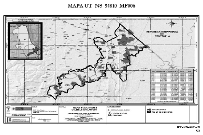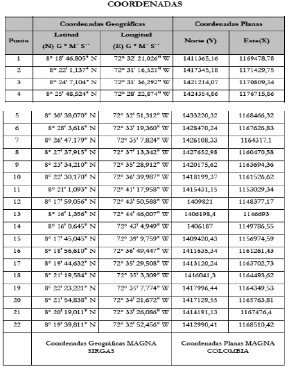 Que a partir de la aprobación de la intervención de la política de restitución transicional de tierras en las veredas mencionadas, el área fue representada en el mapa No. UT_ NS_54810_MF006, elaborado por esta Dirección Territorial, que forma parte integral del presente acto administrativo y que cuenta con las siguientes coordenadas geográficas en grados, minutos y segundos (MAGNA-SIRGAS1 ) puntos extremos del área seleccionada, así: