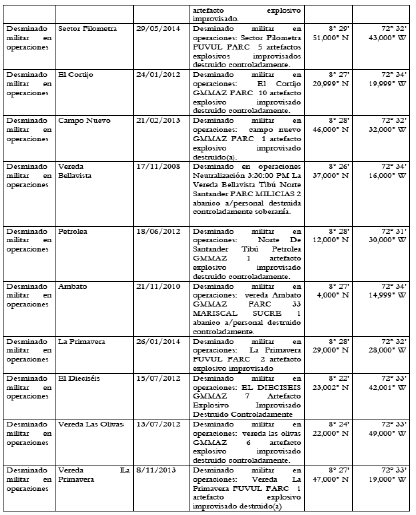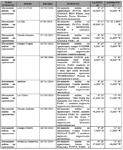 Que se consultó en el repositorio o GDB de información de tipo ambiental, minera, energética, de infraestructura vial, territorial, entre otras, y de índole asociada a nivel nacional y departamental gestionadas y habilitadas periódicamente por la Dirección Catastral y de Análisis Territorial. En relación a la información básica remitida por el AICMA(Acción Integral contra Minas Antipersonal) con fecha de corte 30 de marzo de 2020, que contiene el histórico de accidentes e incidentes de minas antipersonal (MAP), municiones sin explotar (MUSE)y/o de artefactos explosivos improvisados con características de mina antipersonal (AEI), se gestionaron los datos registrados que forman parte del Informe Técnico de Microfocalización ITM que comprende la totalidad del área de la microzona donde se encontraron 25 eventos de diferentes tipos, donde 20 corresponden a desminado militar en operaciones, 2 de sospecha de campo minado, 2 de municiones sin explotar y uno de accidente por MAP, pero ninguno de dichos eventos presenta traslape con las solicitudes intervenidas. Se presenta tabla relacionada.