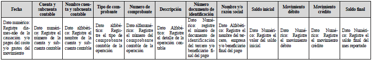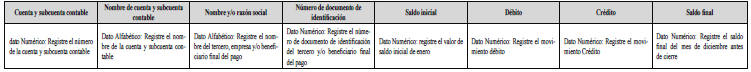 i) La información de los auxiliares a la que se refiere el presente numeral debe ser presentada en el formato indicado en el numeral 2.3 y contener los saldos de todas las cuentas y subcuentas antes de cierre contable, en idioma español, a máximo nivel de cuenta del tercero beneficiario.