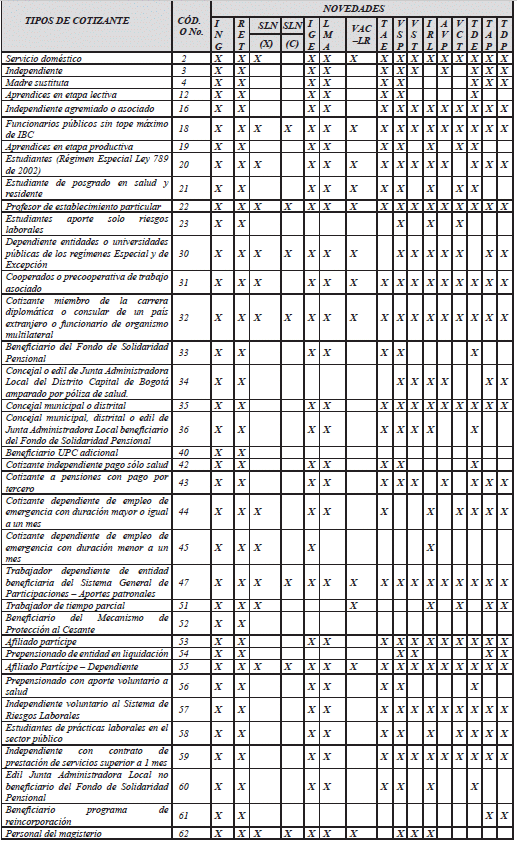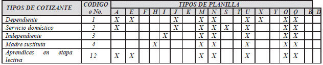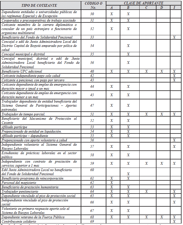 | TIPO DE COTIZANTE | CÓDIGO O No. | CLASE DE APORTANTE | ||||