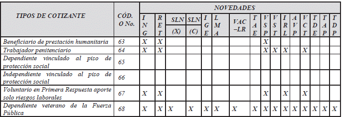 | 4 | 2 | 29 | 30 | A | Tipo de documento del cotizante | CC. Cédula de ciudadanía CE. Cédula de extranjería TI. Tarjeta de identidad PA. Pasaporte CD. Carné diplomático SC. Salvoconducto de permanencia RC. Registro Civil PE. Permiso Especial de Permanencia PT. Permiso por Protección Temporal |