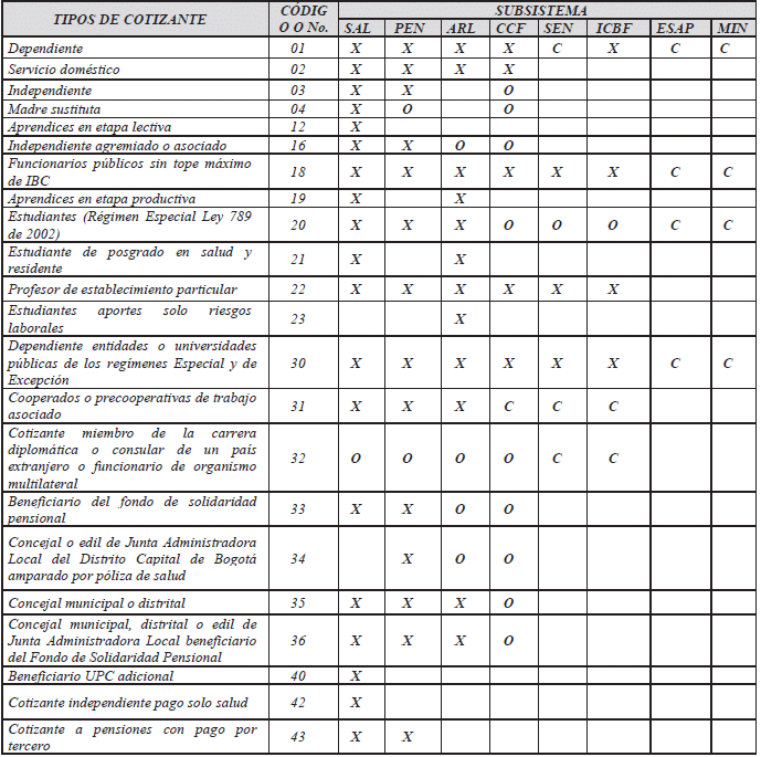 *El aporte de estos tipos de cotizantes a pensiones corresponde al Piso de Protección Social