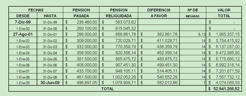 Igualmente se condena a pagarle por concepto de reajustes pensionales la suma de CINCUENTA Y DOS MILLONES NOVECIENTOS CUARENTA Y UN MIL DOSCIENTOS SESENTA Y SEIS PESOS CON CINCUENTA Y DOS CENTAVOS ($52'941.266,52) moneda corriente, entre el 27 de agosto de 2001 y el 30 de junio de 2009; siendo el monto de la pensión a partir del 1° de julio de este último año, de UN MILLON SETENTA Y OCHO MIL NOVECIENTOS NUEVE PESOS CON SETENTA Y UN CENTAVOS ($1'078.909,71) moneda corriente.