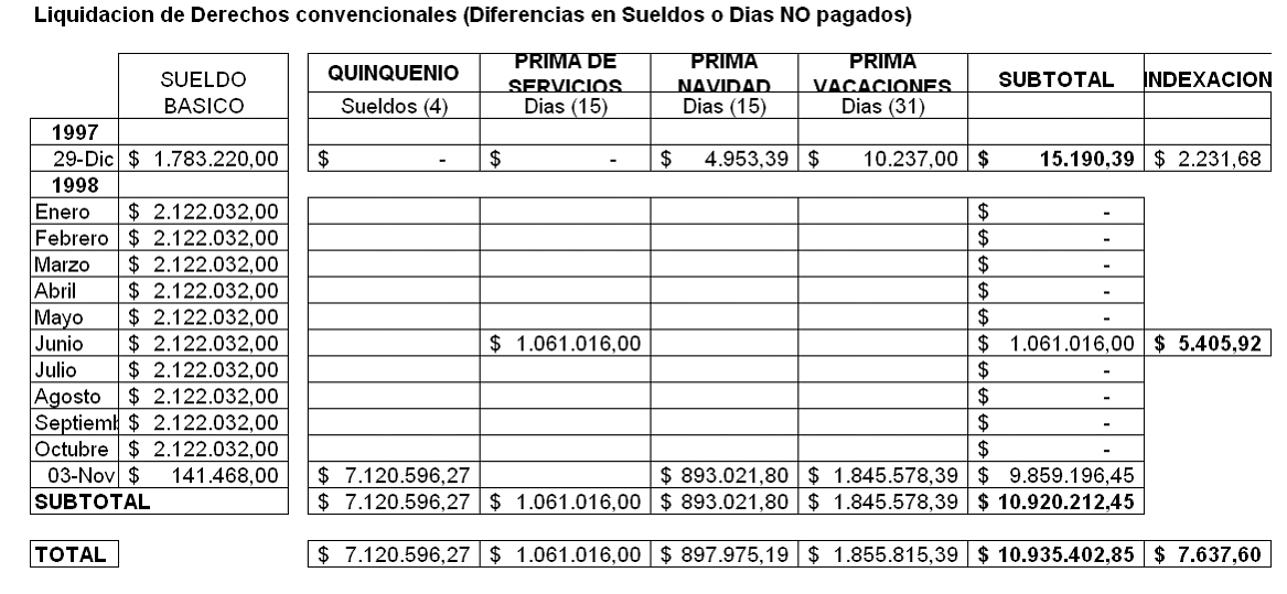Realizada la confrontación con lo cancelado por estos conceptos en lo estrictamente legal desde el 29 de diciembre de 1997 (folios 165, 755 y 756 del cuaderno principal), se obtienen las diferencias adeudadas, para el caso del quinquenio los 4 sueldos, por prima de servicios y de navidad un saldo de 15 días para cada una, y para la prima de vacaciones 31 días, con lo cual hechas las operaciones del caso, arroja un total de $10.935.402,85, aclarando que solamente es dable indexar a la fecha de ejecutoria de la sentencia del Consejo de Estado que lo fue el 3 de agosto de 1998 (folio 126 vto. ibídem) algunas pocas acreencias generadas antes de esa data, cuya actualización por ese lapso es de $7.637,60. Lo anterior se detalla en el siguiente cuadro: