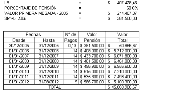 El cálculo se efectuó sobre un ingreso base de liquidación de $407.478,46, al cual se le aplicó una tasa de reemplazo del 60% como lo dispone el artículo 40 de la Ley 100 de 1993, lo que arrojó el valor de $244.487,07; pero como de acuerdo con ese mismo precepto y el artículo 35 ibídem, el monto pensional no puede ser inferior al salario mínimo legal, se fija el valor inicial en $381.500,oo que era el S.M.L.V. para el año 2005. Por concepto de retroactivo pensional entre el 30 de diciembre de 2005 y el 31 de agosto de 2012, se impondrá la suma de $45'060.966,67, todo de conformidad con el siguiente cuadro: