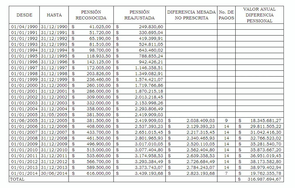 En este orden de ideas, se impondrá a la accionada el pago de la suma de $316.987.694,67, por diferencias pensionales, exigibles durante el período no prescrito, comprendido entre el 1° de junio de 2005 y el 30 de junio de 2014, tomando como primera mesada pensional la suma de $249.830,60, que con los incrementos de ley y hechas las operaciones del caso, asciende para el año 2005 a una mesada reajustada por valor de $2.419.909,03 y para el 2014 a la cantidad de $3.439.193,68, con la cual se ha de continuar sufragando la pensión. Lo anterior se expresa en el siguiente cuadro: