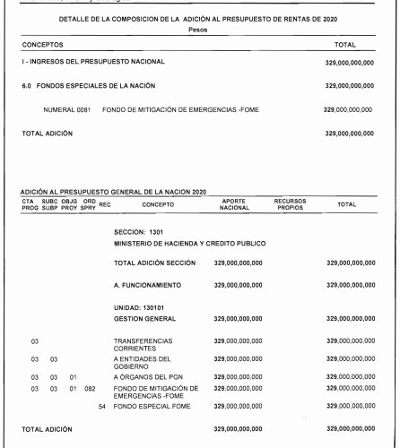 | ADICIÓN AL PRESUPUESTO GENERAL DE LA NACION 2020 | |