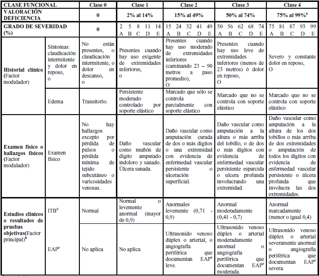 a. Clase de deficiencia: La tabla de calificación más amplia contiene cinco (5) clases (columnas), según lo aplicable en cada capítulo; se numeran de 0 a 4. No obstante hay algunas tablas con sólo tres (3) clases.